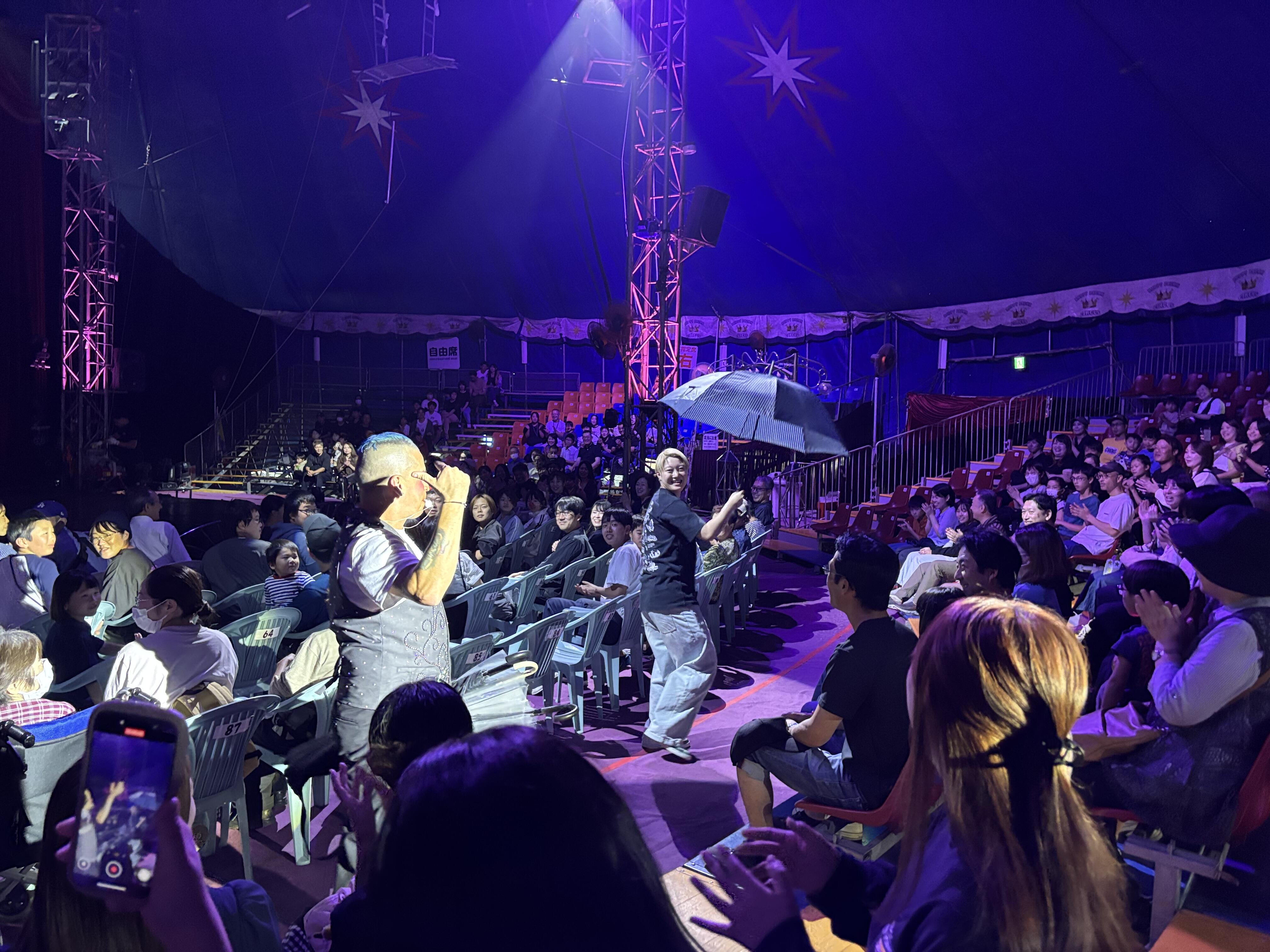 観客が一体となって、トランポリンや空中ロープや空中ブランコ、一輪車やモーターバイクの演技、火を噴く大道芸など白熱の演技に息を飲み、拍手をし、多くの家族が楽しむ姿も観察することができ、有意義な時間となりました。