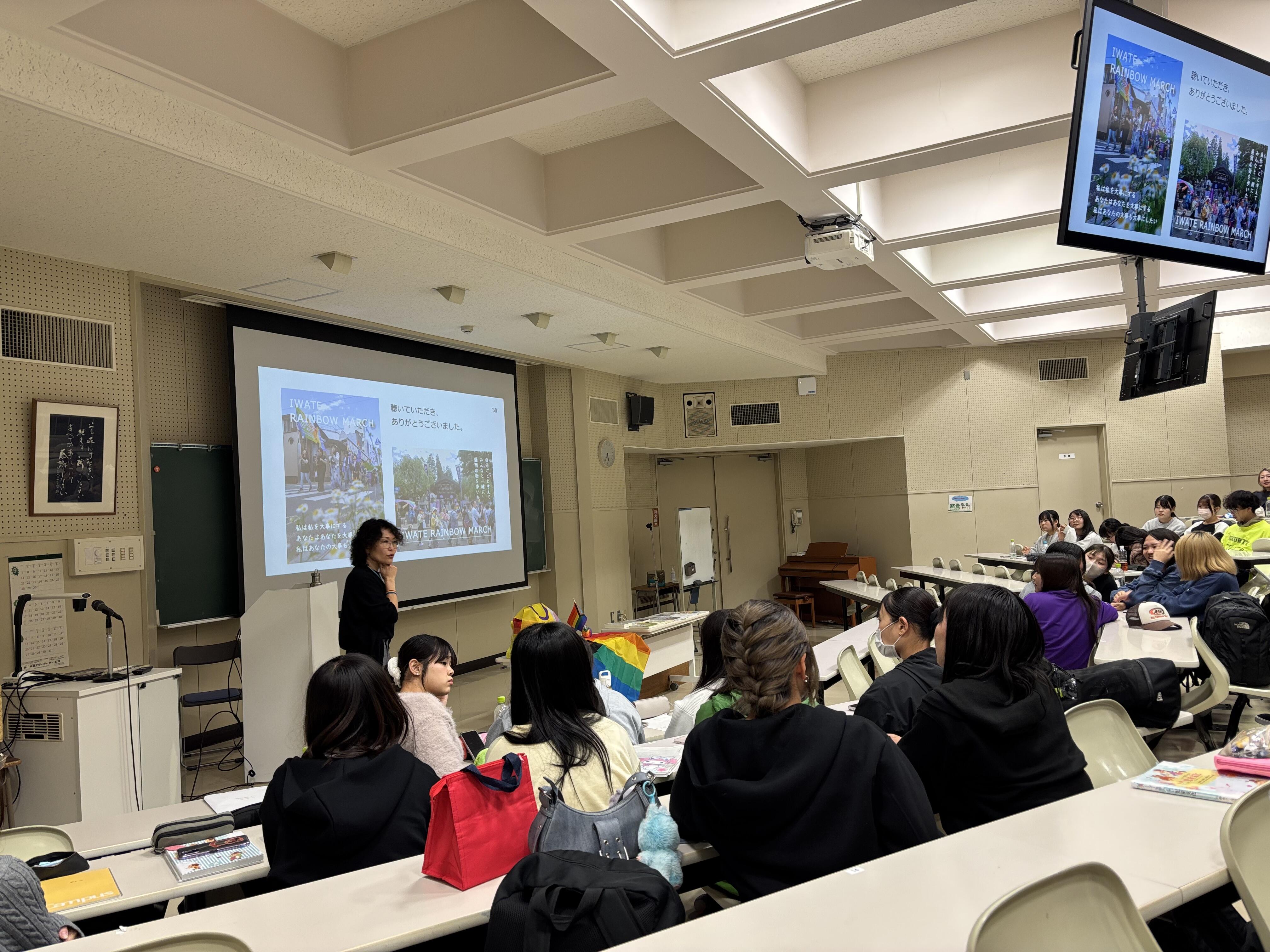 これから子どもたちとかかわる仕事についていく学生にとって、知っておかなければならないテーマです。いわてレインボーマーチで活動する山本さんから、「LGBTQ+基礎知識 ・特権を多く持つマジョリティ 」について解説を受け、実際にあった当事者のお話や、岩手県内で起こっていること、現在の活動の様子などお聞きしました。学生たちは、身近で起こっていること、これから起こりうることなど自分事として考える機会となりました。そして、「わたしたちにできること」はなにか、そして、誰もが生きやすい社会にしていくには何が必要かを考えました。