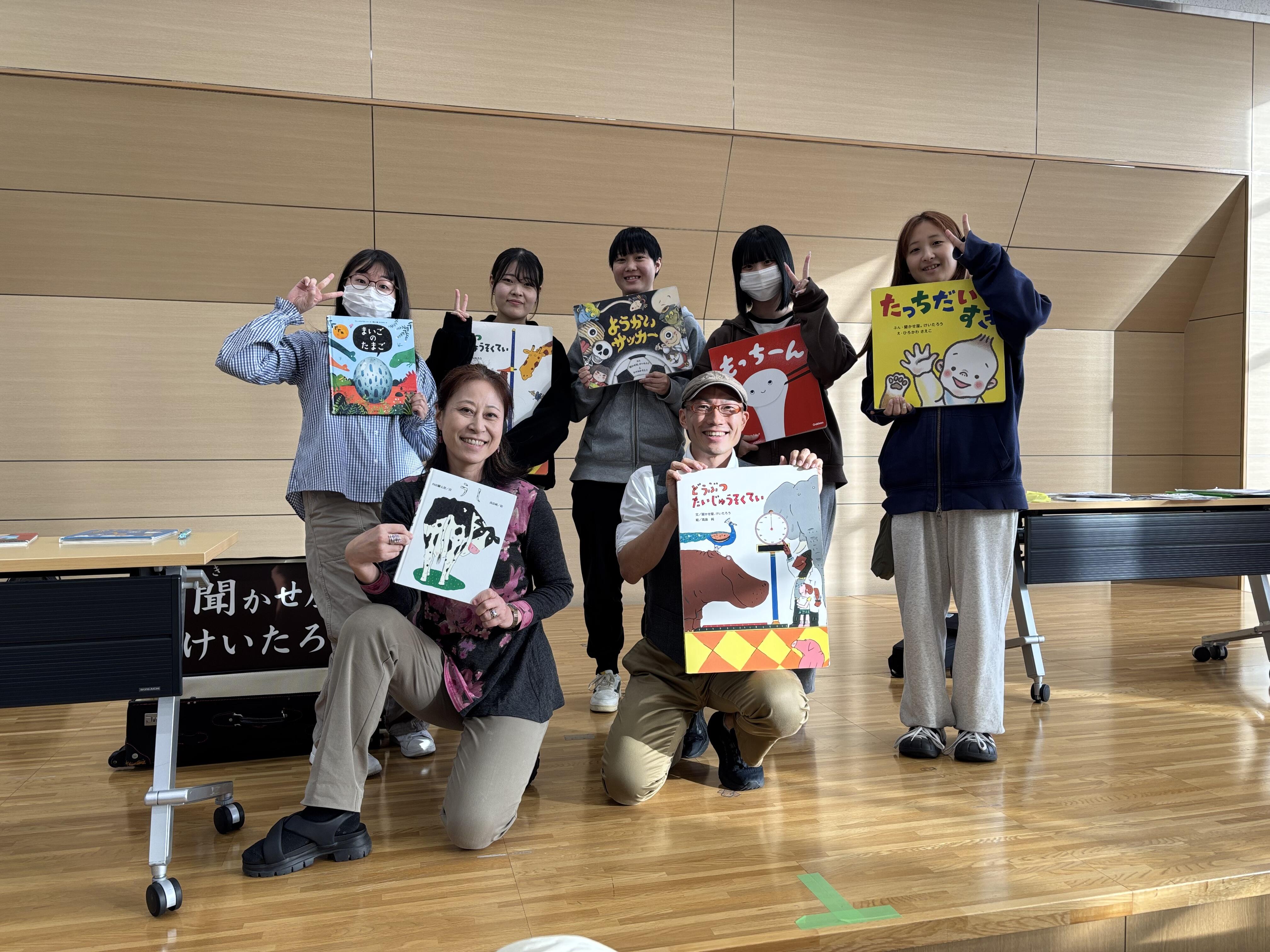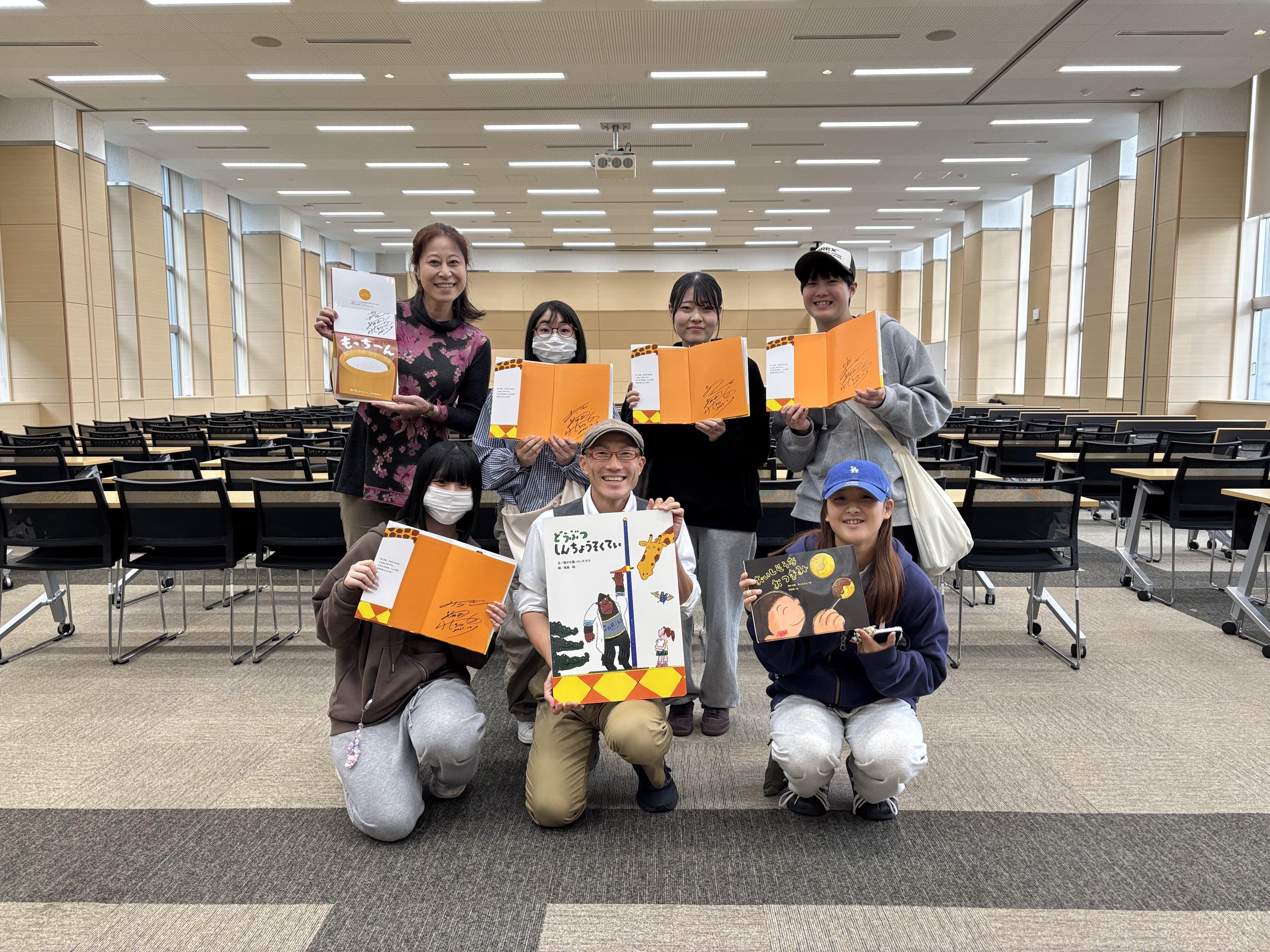 10月19日午後開催された認定絵本士養成講座開講記念「絵本作家講演会」では、絵本作家の聞かせ。けいたろうさんのお話を伺いました。実際の夜の路上での読み聞かせの様子や、保育現場での子どもの反応、絵本製作をどのように編集者と行っていくかなど具体的なお話を聞くことができました。丸山ちはや助教のゼミ生たちは最前列で生の読み聞かせを体験して、著書の絵本を購入し、サインもそれぞれもらい、今後の保育士の仕事に役立てられるまなびを深めました。