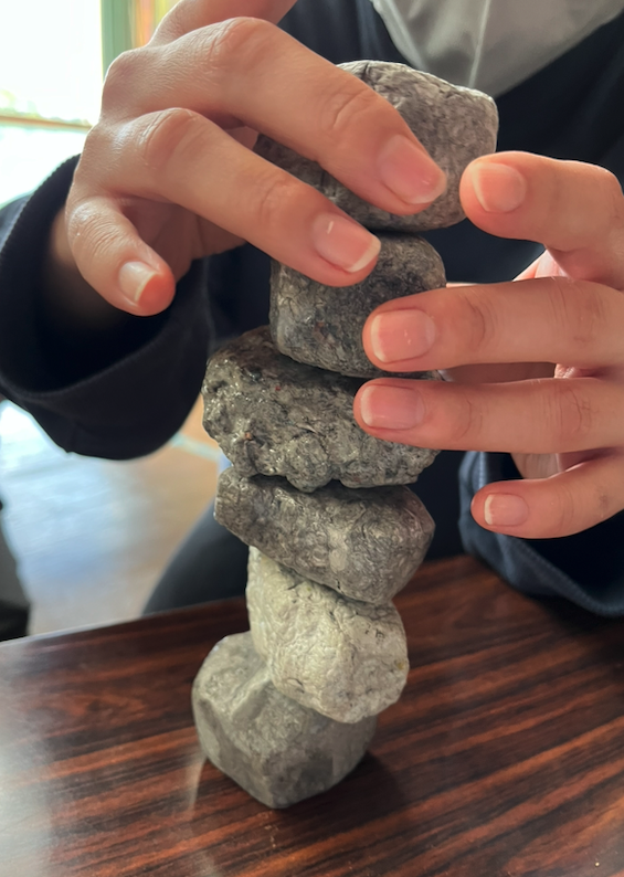 手順は①破く ②こねる ③固める ④磨く ⑤遊ぶ!(今回は石積みをして遊びました)