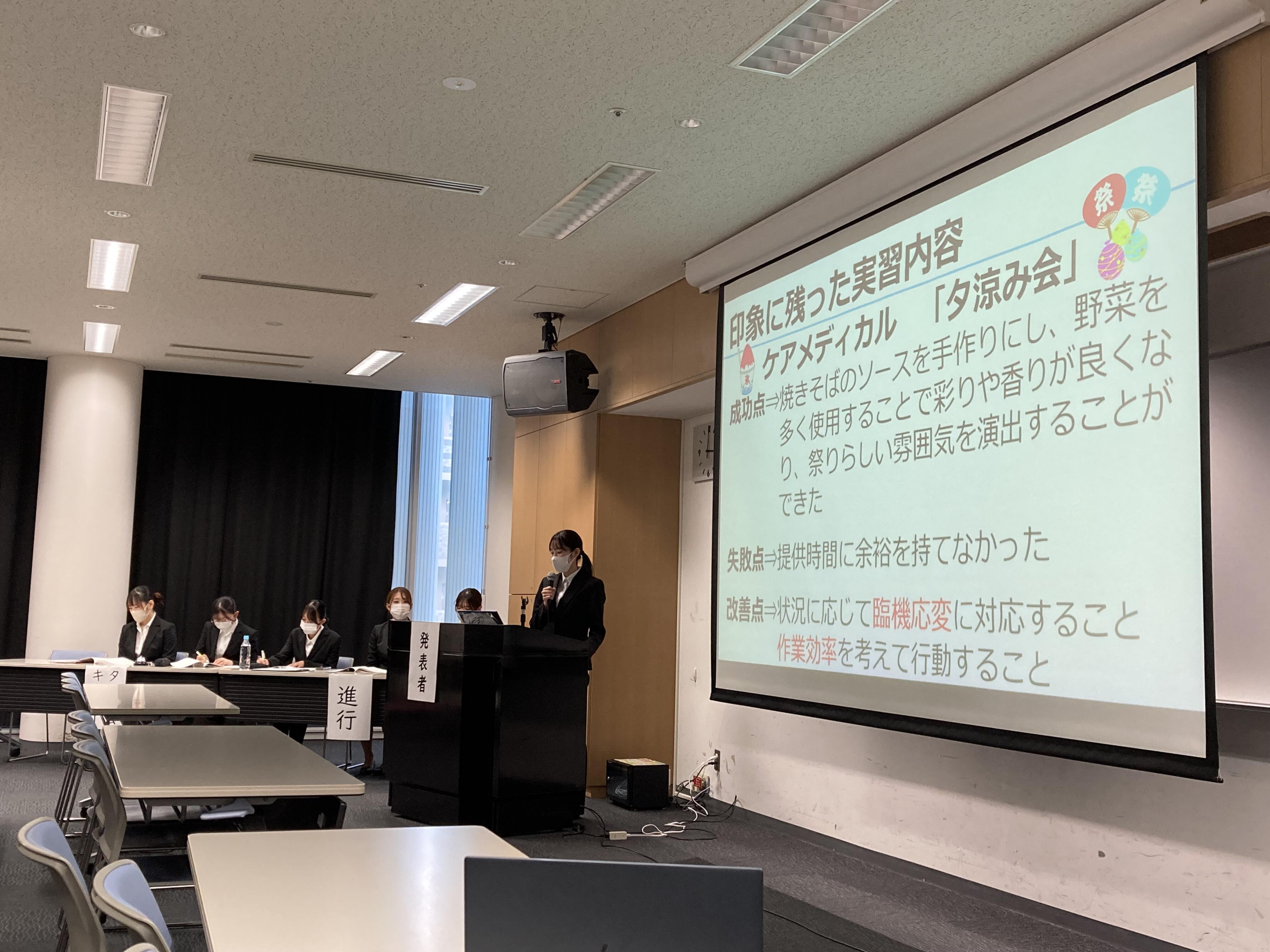 栄養科学部栄養科学科4年生は、医療機関において10日間または15日間の臨地実習に参加します。実際の臨床現場で、管理栄養士の役割や業務の実際について実践的に学びます。実習終了後は、得た学びや経験を、同級生や後輩(3年生)、教員に対して報告します。