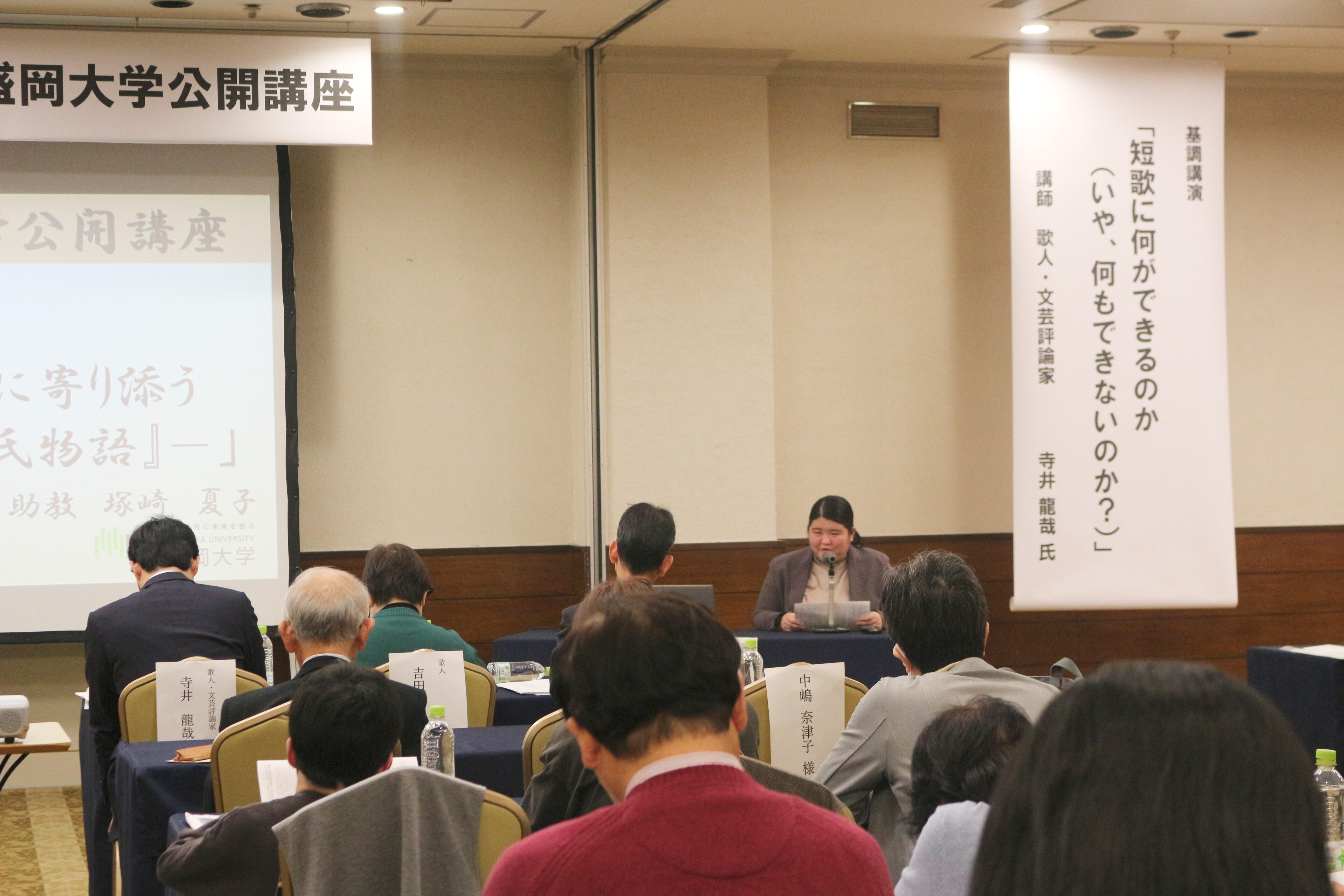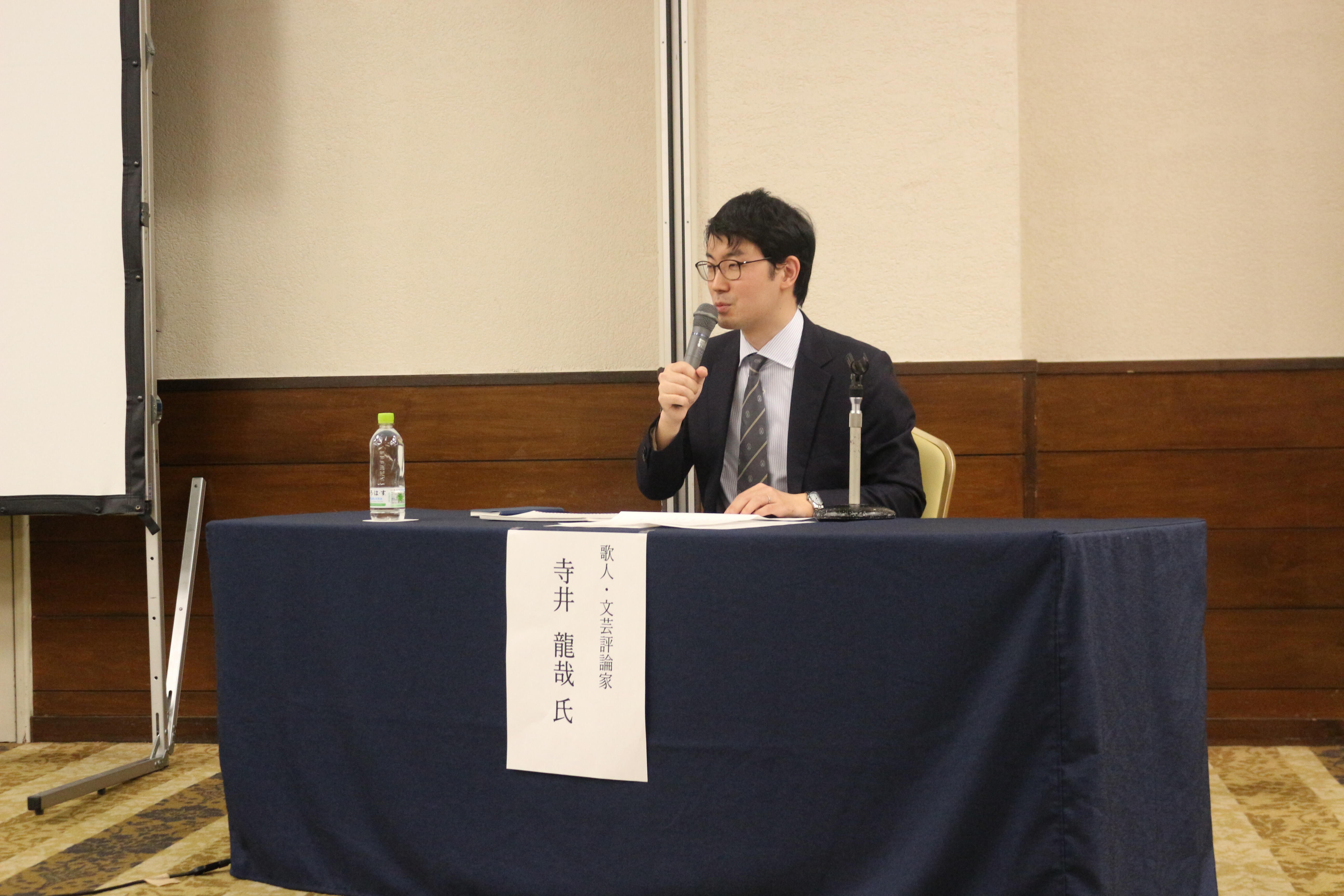 第一部では、特別講師として歌人・文芸評論家の寺井龍哉先生をお招きし、「短歌に何ができるのか(いや、何もできないのか?)」と題した基調講演を行っていただきました。