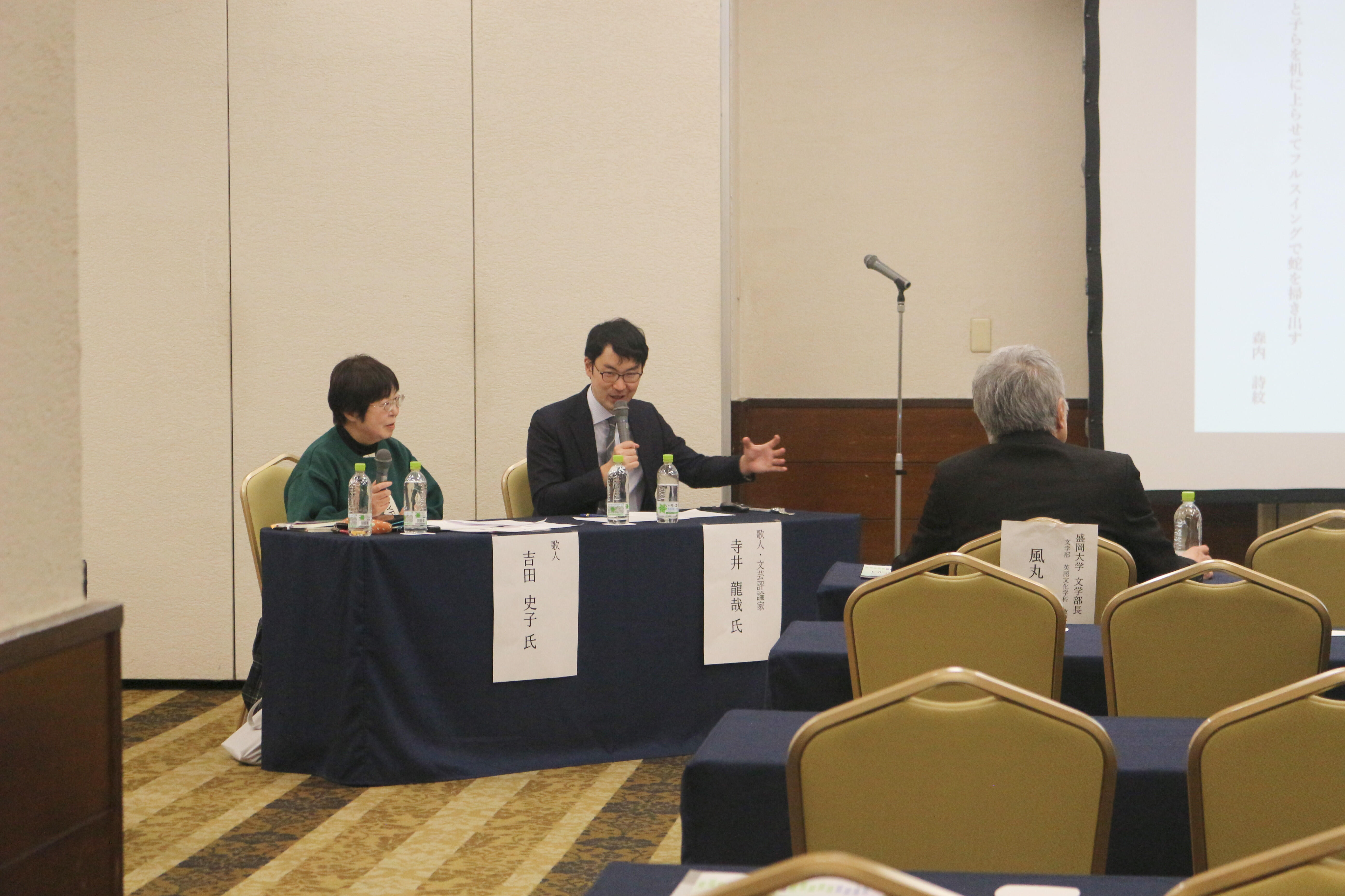 第三部では、歌人であり、元本学文学部非常勤講師の吉田史子先生と、第一部にご登壇いただいた寺井先生より、事前に公募した短歌の講評をいただきました。当日は受講されなかった方々にもたくさんご応募いただき、誠にありがとうございました!