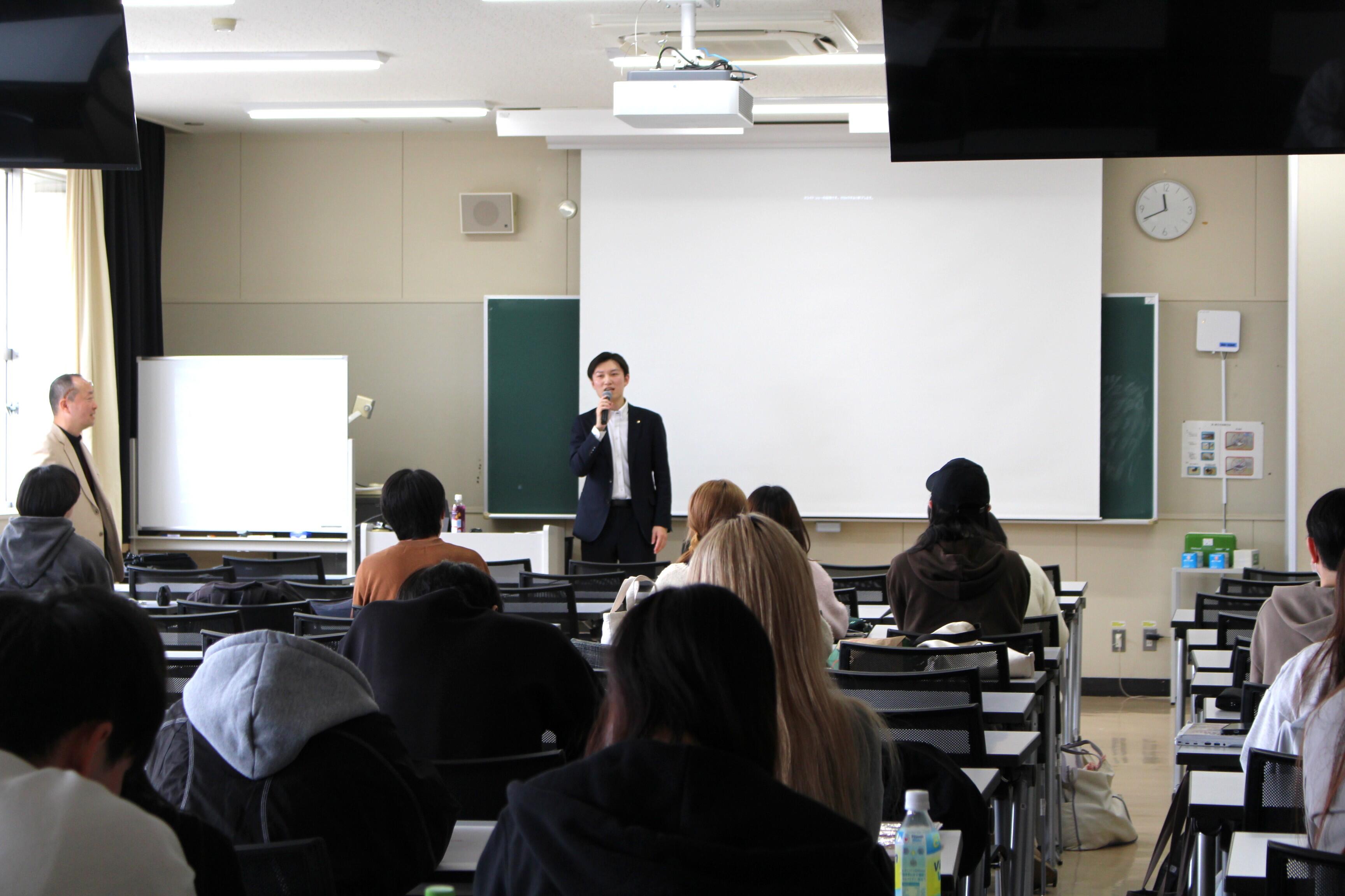 2025年11月27日(木)、文学部英語文化学科「グローバルコミュニケーション演習B」(小川修平教授担当)では、北日本銀行人事部で勤務されている本学卒業生の方を特別講師としてお招きました。