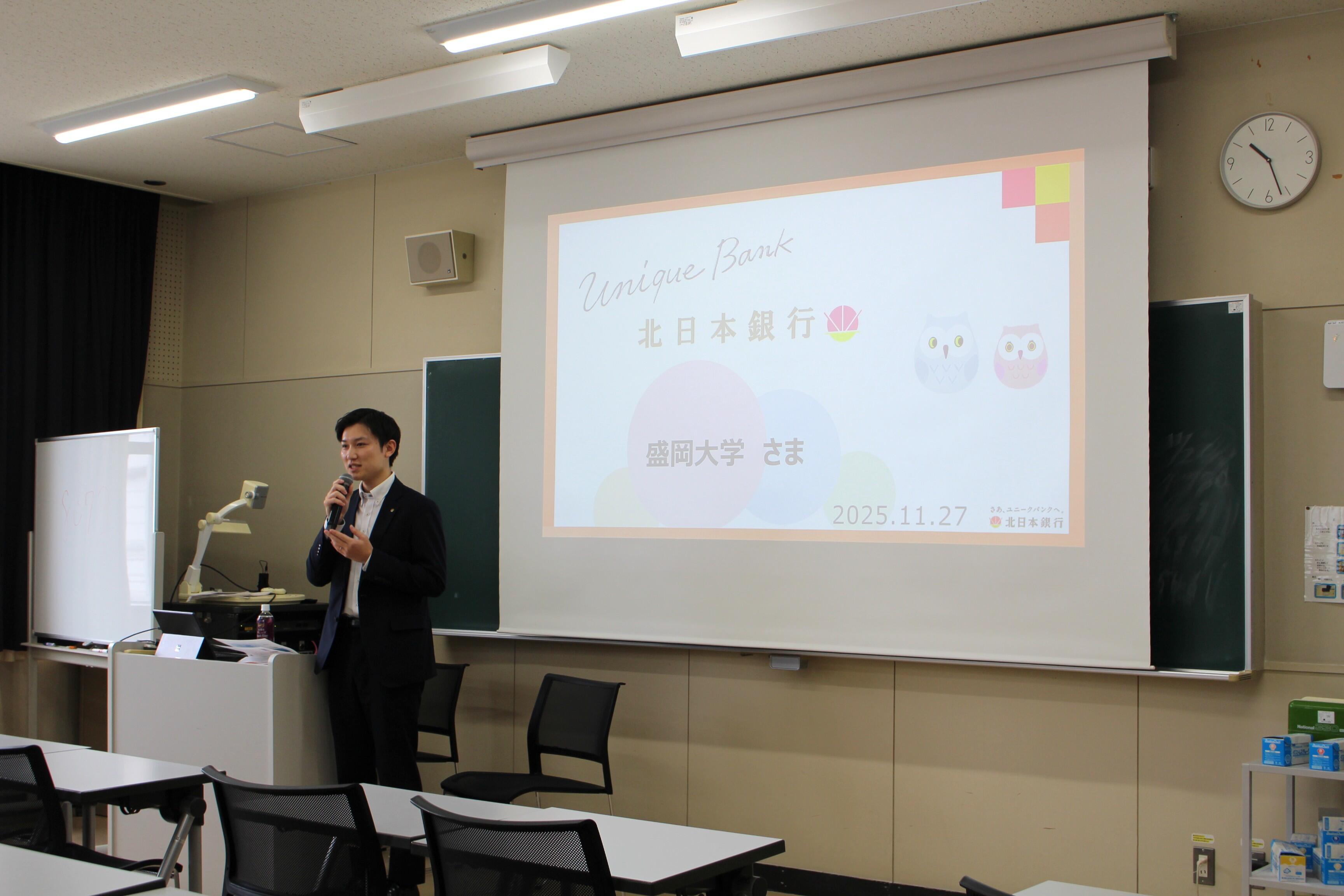 2025年11月27日(木)、文学部英語文化学科「グローバルコミュニケーション演習B」(小川修平教授担当)では、北日本銀行人事部で勤務されている本学卒業生の方を特別講師としてお招きました。