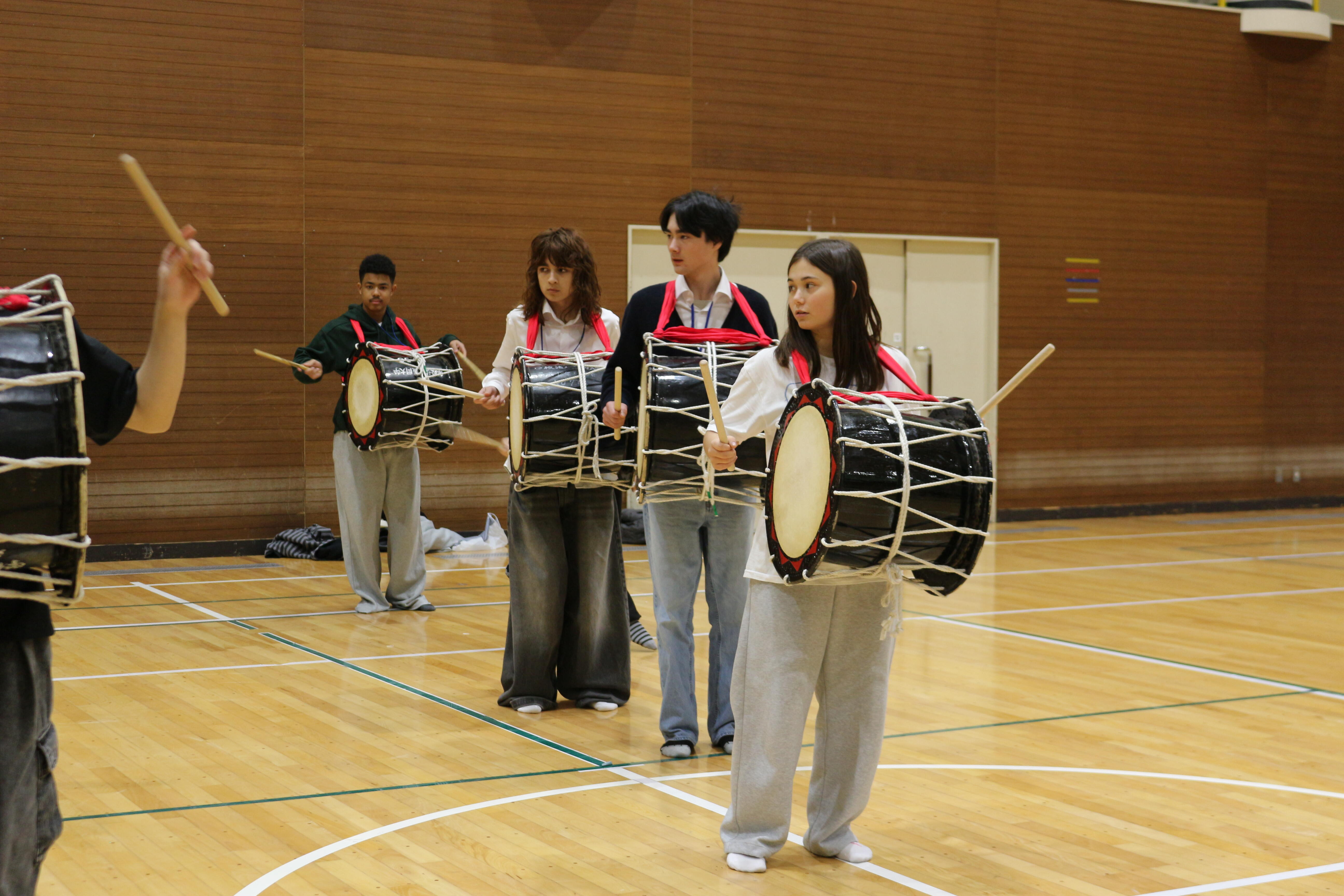 当日は大学の図書館を見学した後、日本文学科嶺岸玲子教授の指導のもと、本学学生と日本語や英語を使いながらカナダやビクトリアについての紹介文を考え発表する活動や、英語文化学科照井悦幸教授の武士道についての特別講義にも参加しました。また、盛岡大学・盛岡大学短期大学部さんさ踊り実行委員会によるさんさ踊り体験では、太鼓、笛、踊り、ホイッスルの4つのパートに分かれて練習した後、全体で合わせて演奏・演舞しました。練習中は熱心に学生の動きを見て学び、休憩時間中も練習をし続ける中高生もおり、さんさ踊りの魅力を十分に味わったようでした。
