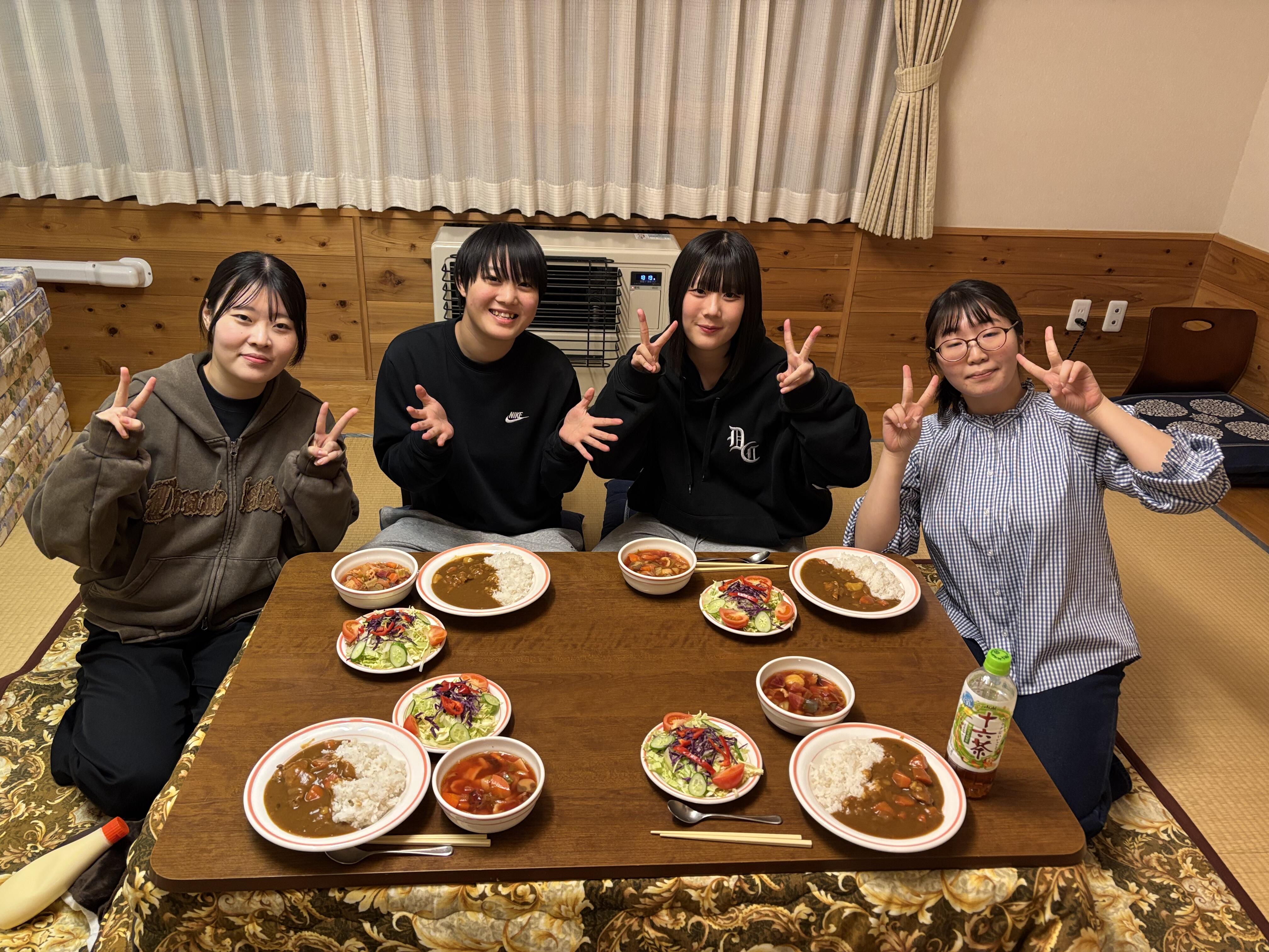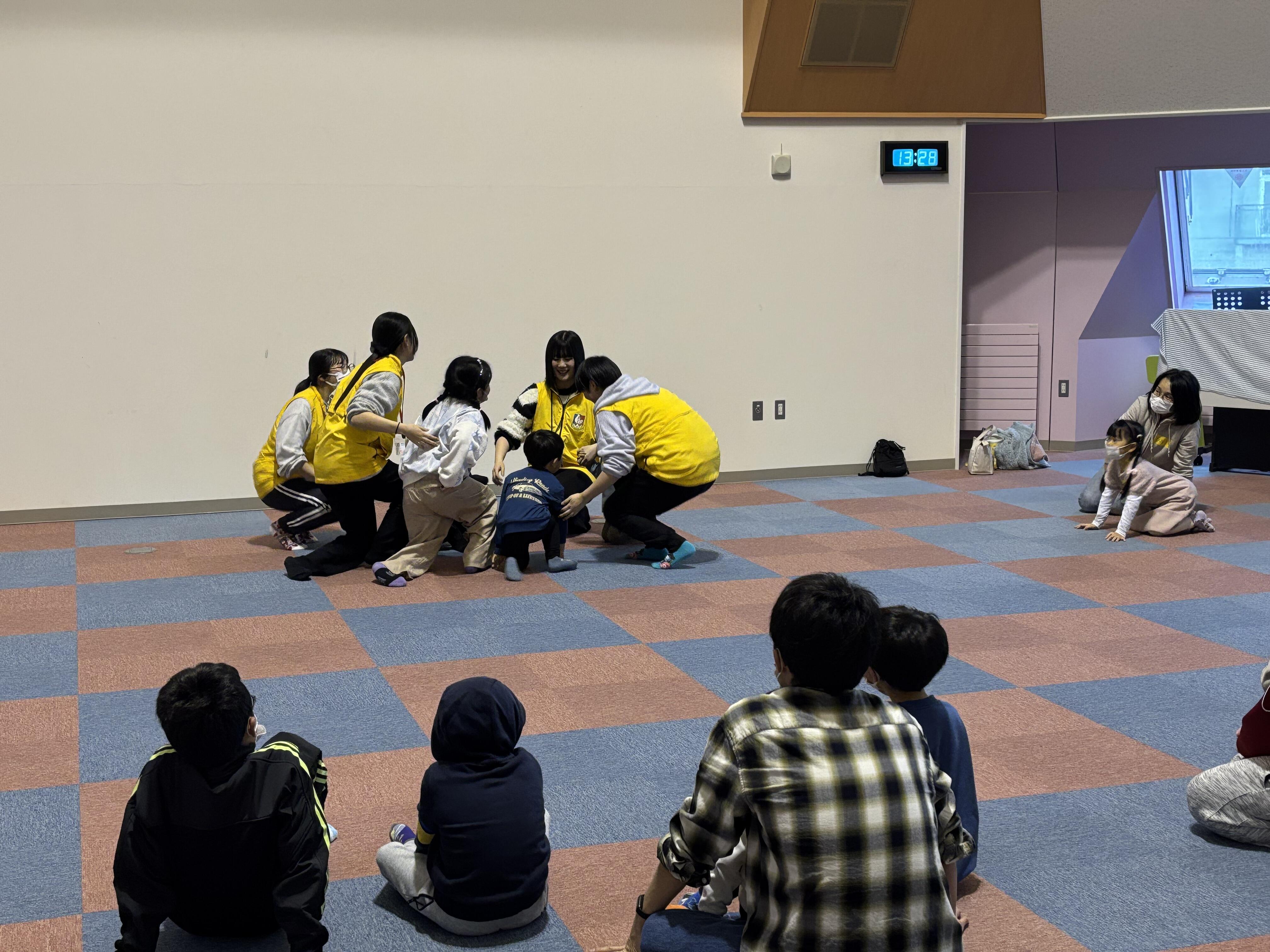 夜は、宿泊施設に泊まり、みんなで、自炊しました。この日のメニューはカレーライスと野菜たっぷりサラダ、ビーツとイタリアパスタのスープにミルクデザート。みんなで分担して作りました。そのあとは、各自がストーリーテリングを披露しました。三枚のお札、漁師や釣り、キュウリもぎ、大村藩の灰坊のお話など。翌日は、ちはやゼミのスペシャル遊びの広場を開催!伝承遊びや、ゴム飛び、エプロンシアターなど盛りだくさんのプログラムで、35名もの参加者がありました。学生たちも充実した学びとなりました。