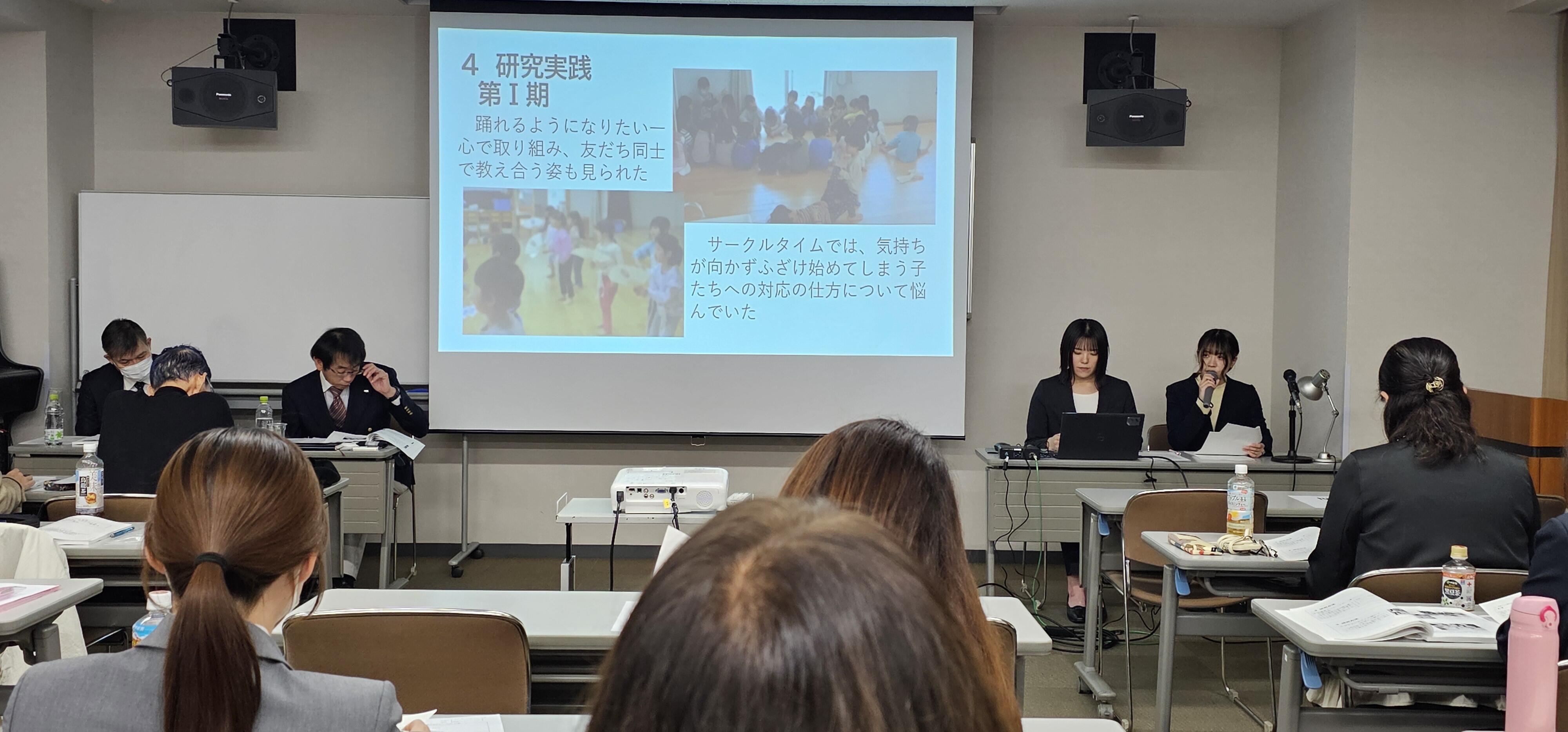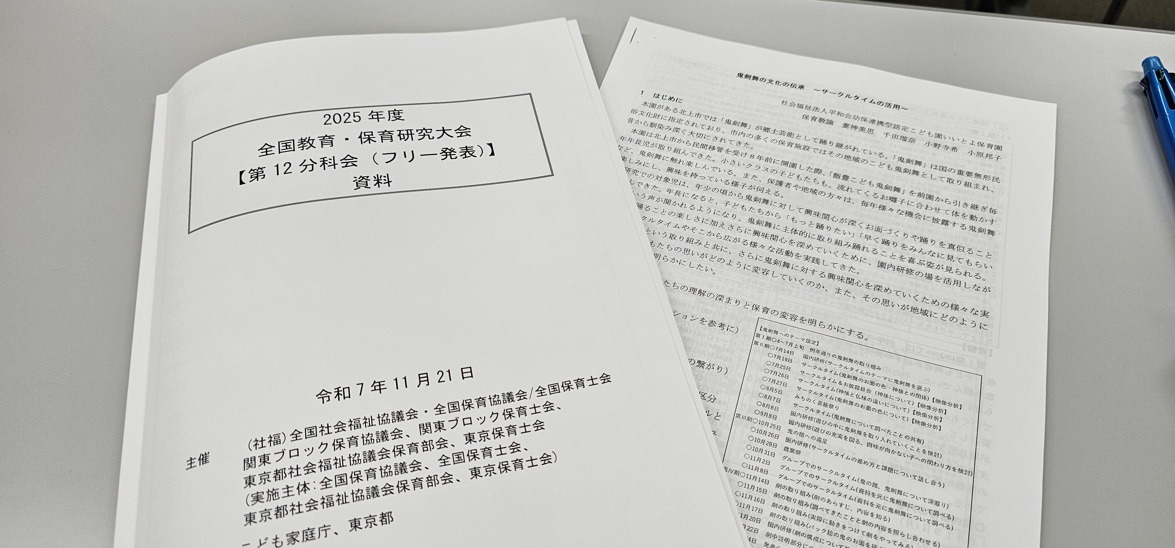 この度2025年度全国教育・保育研究大会の中で行われた第12分科会(フリー発表)にて、『鬼剣舞の文化の伝承~サークルタイムの活用~』のいうテーマで、本学の保育・幼児教育コースの卒業生である妻神美思(さいのかみみこと)先生と、幼児教育科の卒業生である細川瑠奈(ほそかわるな)先生のお二人が主の発表者として登壇し、園での実践研究を発表されました。お二人が所属をしている社会福祉法人平和会幼保連携型認定こども園いいとよ保育園は北上市に位置し、地域に根差している鬼剣舞という伝承文化を大切にしてきました。その中で子どもたちが主体的に鬼剣舞にどのように関わっていったのか、また保育者としてどのように子どもたちと一緒に保育を展開していったのかに着目し研究を行いました。この研究は岩手県の保育研究大会では優秀賞を受賞し、北海道・東北ブロックの保育協議会会長より全国大会への推薦をいただく形で今回の発表に至りました。