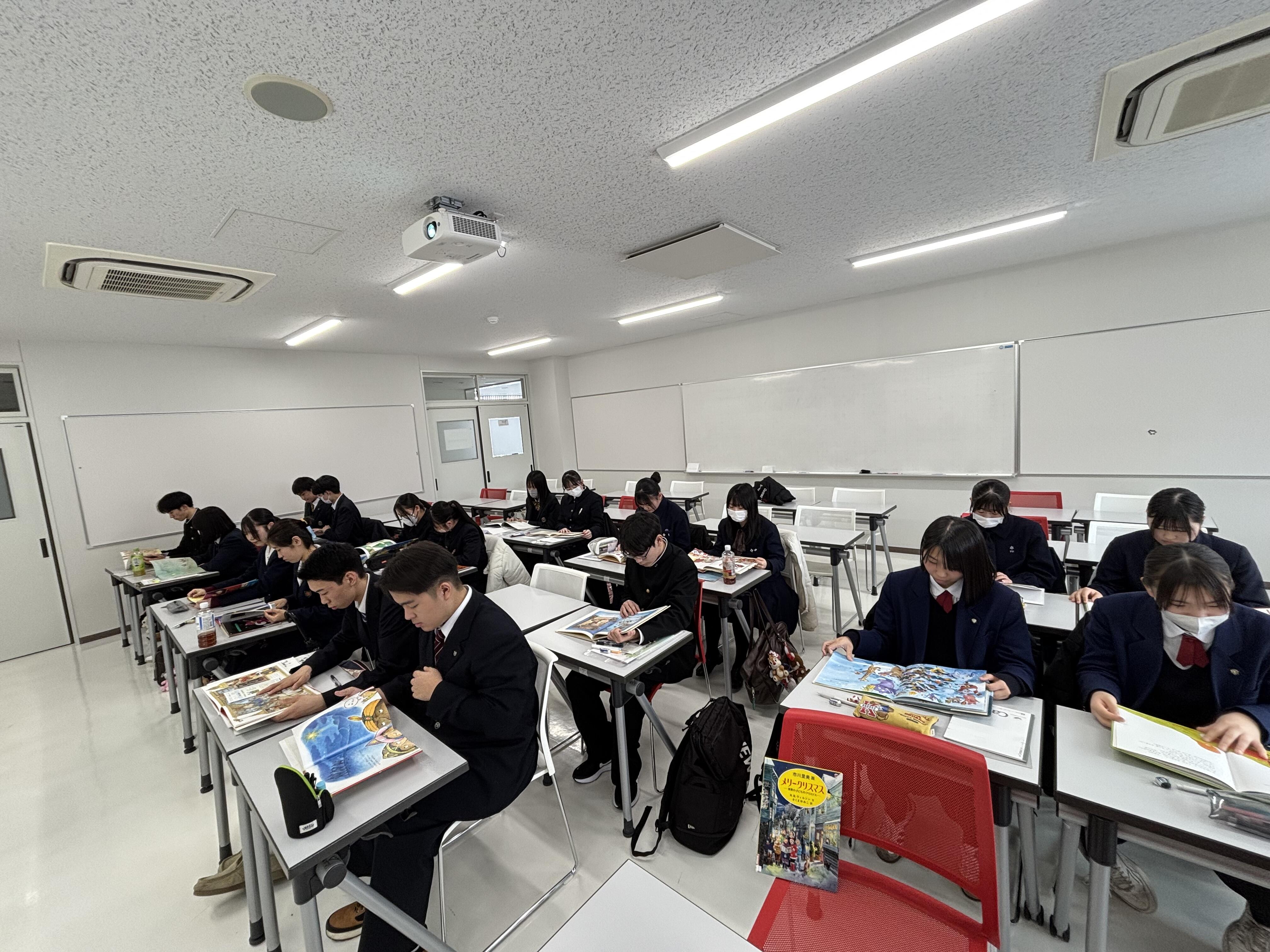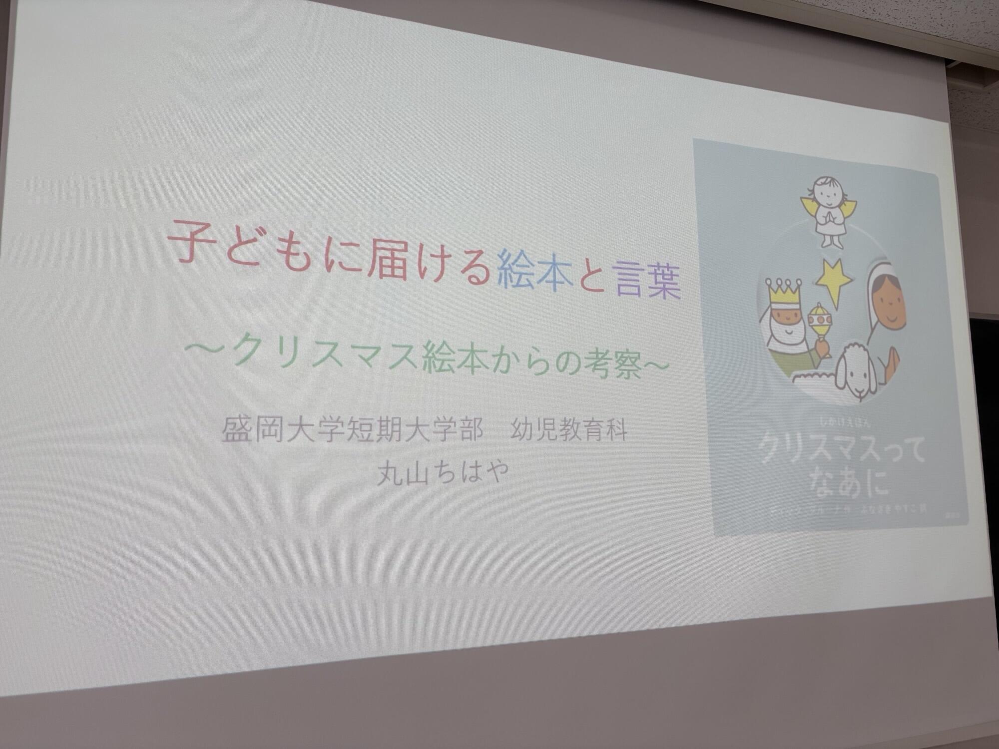 岩崎基次先生の「幼児と遊びと学び」。小川博敬先生の「発達障害の理解と支援」の後に、続いて、丸山ちはや先生の「子どもに届ける絵本と言葉~クリスマス絵本からの考察」では、クリスマス絵本を各自が手にして、そこに何が表現されているかを考え、意見を出しあいました。また、そもそもクリスマスとは何にか、サンタクロースとはだれなのか、なぜプレゼントをもらうのか、あげるのかなどを文化人類学や民俗学、歴史、聖書、コーランなどを取り上げながら考察していきました。参加学生からは、「クリスマスの意味が分かって楽しかった」「子ども向けのクリスマスの意味を考えることができて、ぜひ家族にも伝えたい」等感想がありました。