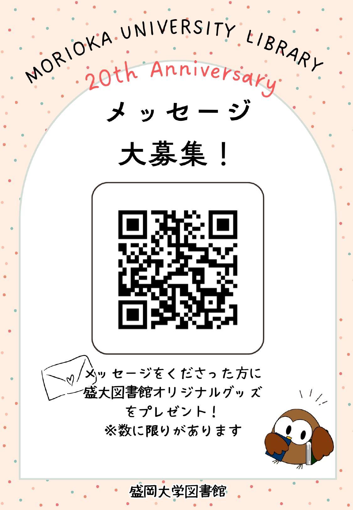 2025年9月に盛岡大学図書館は砂込に新館を構えて20周年を迎えました。図書館ではこれを記念して『盛岡大学図書館報』を20周年記念特別号として発行いたします。つきましては利用者の皆さまから図書館へのメッセージを募集し企画記事のなかで紹介させていただきたくご協力をお願いいたします。『盛岡大学図書館報』は今回よりデジタル媒体での発行としウェブで公開いたします。