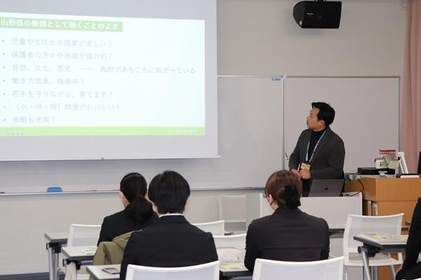 教育委員会の方にご来学いただき、山形県の魅力や教育の状況、教員の働き方の現状、募集要項や採用試験の内容などについてご説明いただきました。