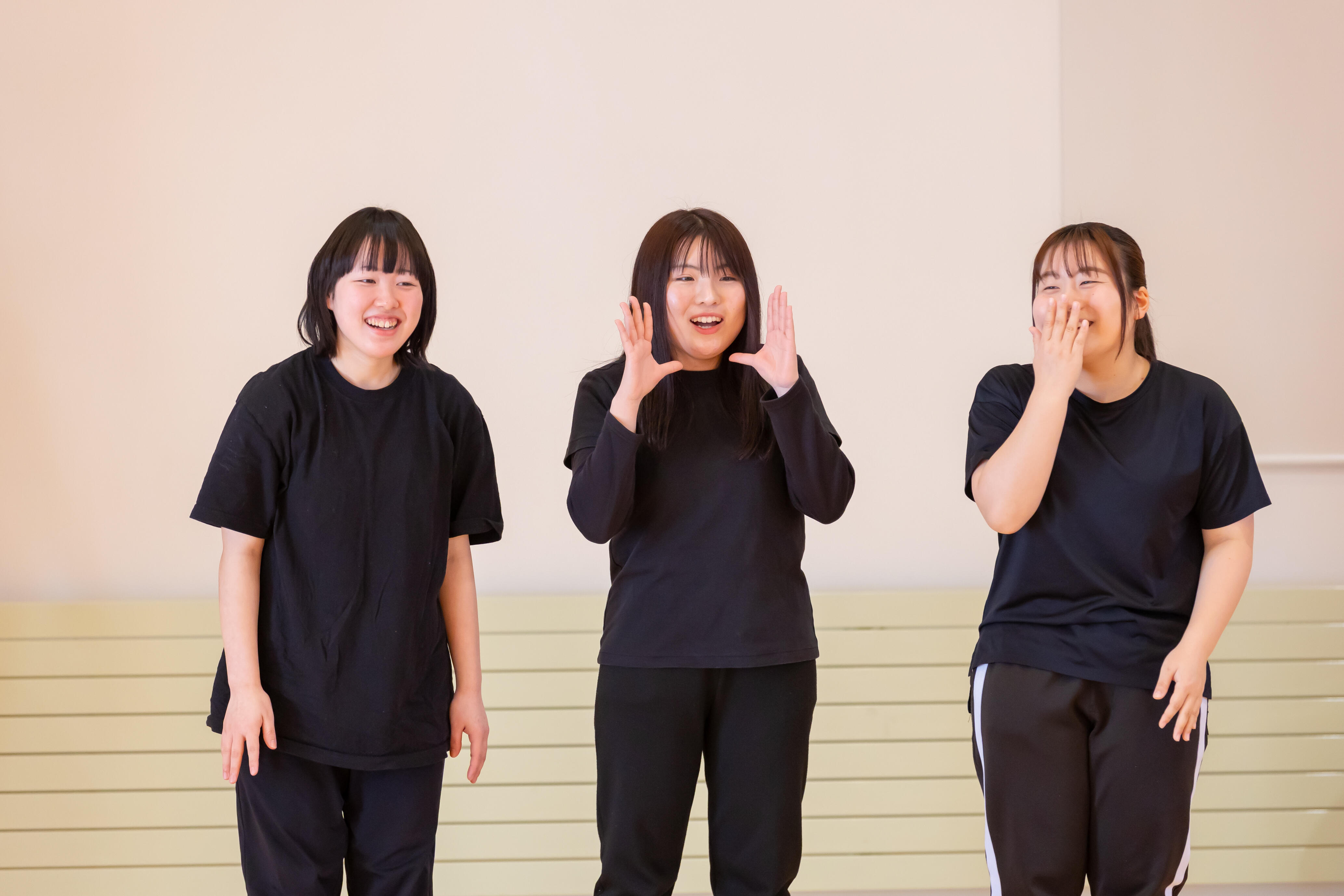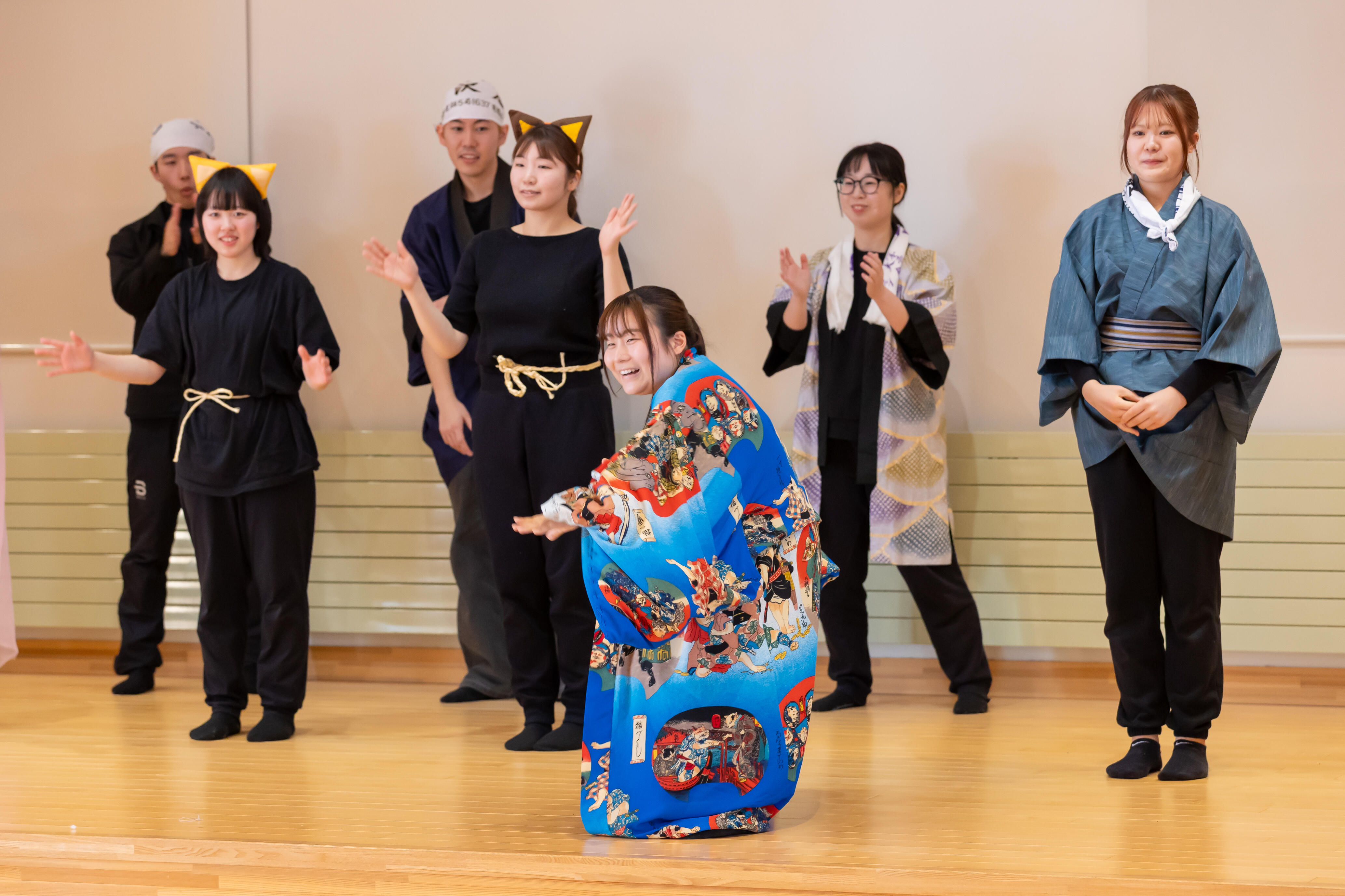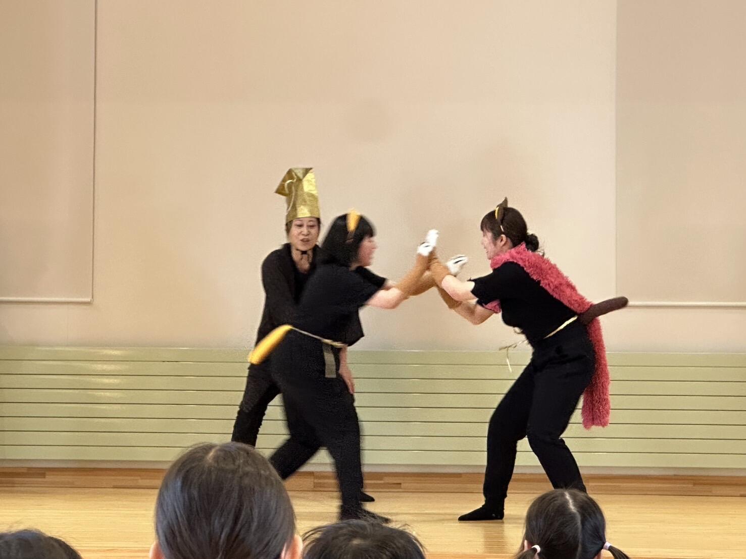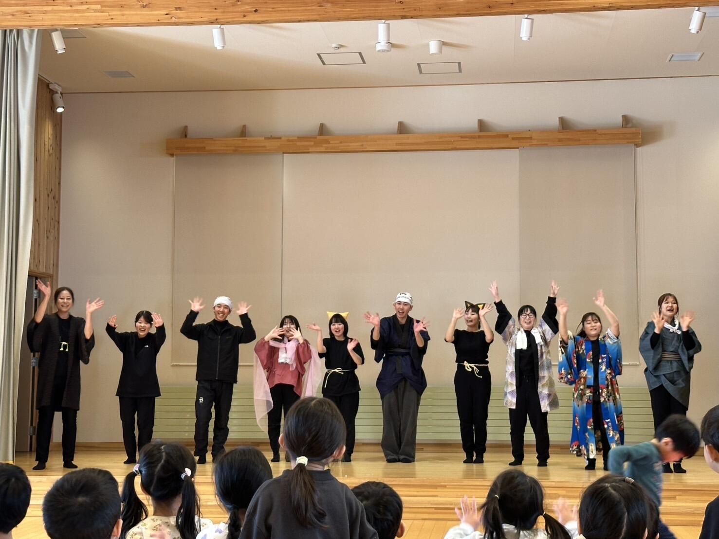 短大部の丸山ちはや助教の担当授業「遊びと言葉」の受講生ら9人が、岩手県岩泉町の民話「佐助どんと猫の相撲」をオリジナル脚本で劇にしたもの、絵本スイミーをもとに、オリジナルオノマトペで身体表現したものなど45分間の上演でした。