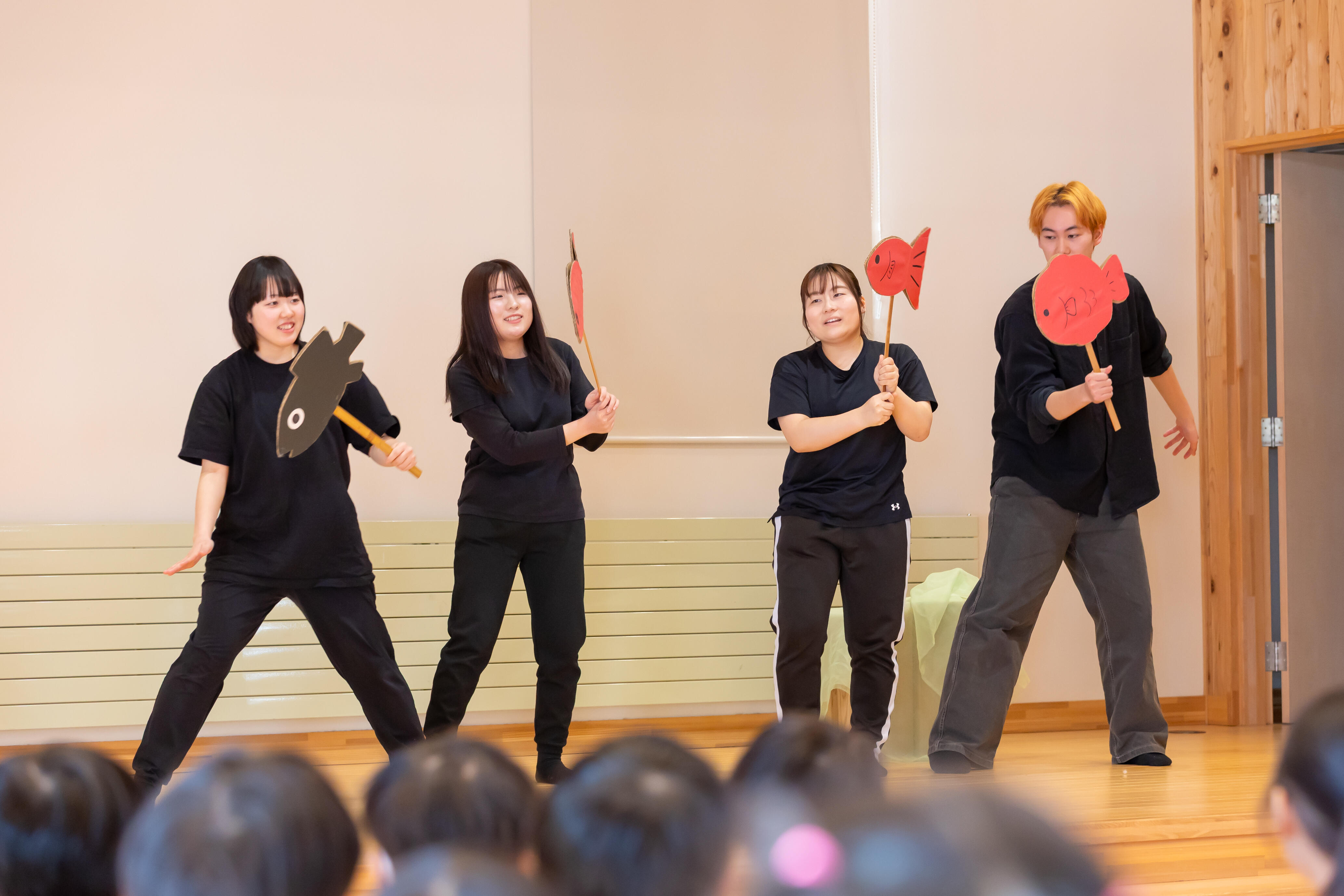 学生たちはこの日のために、演技、小道具、音響などを試行錯誤して、22日の学内発表を経て、いかに幼児にわかり、楽しめるのかを模索しながら練習を重ねてきました。