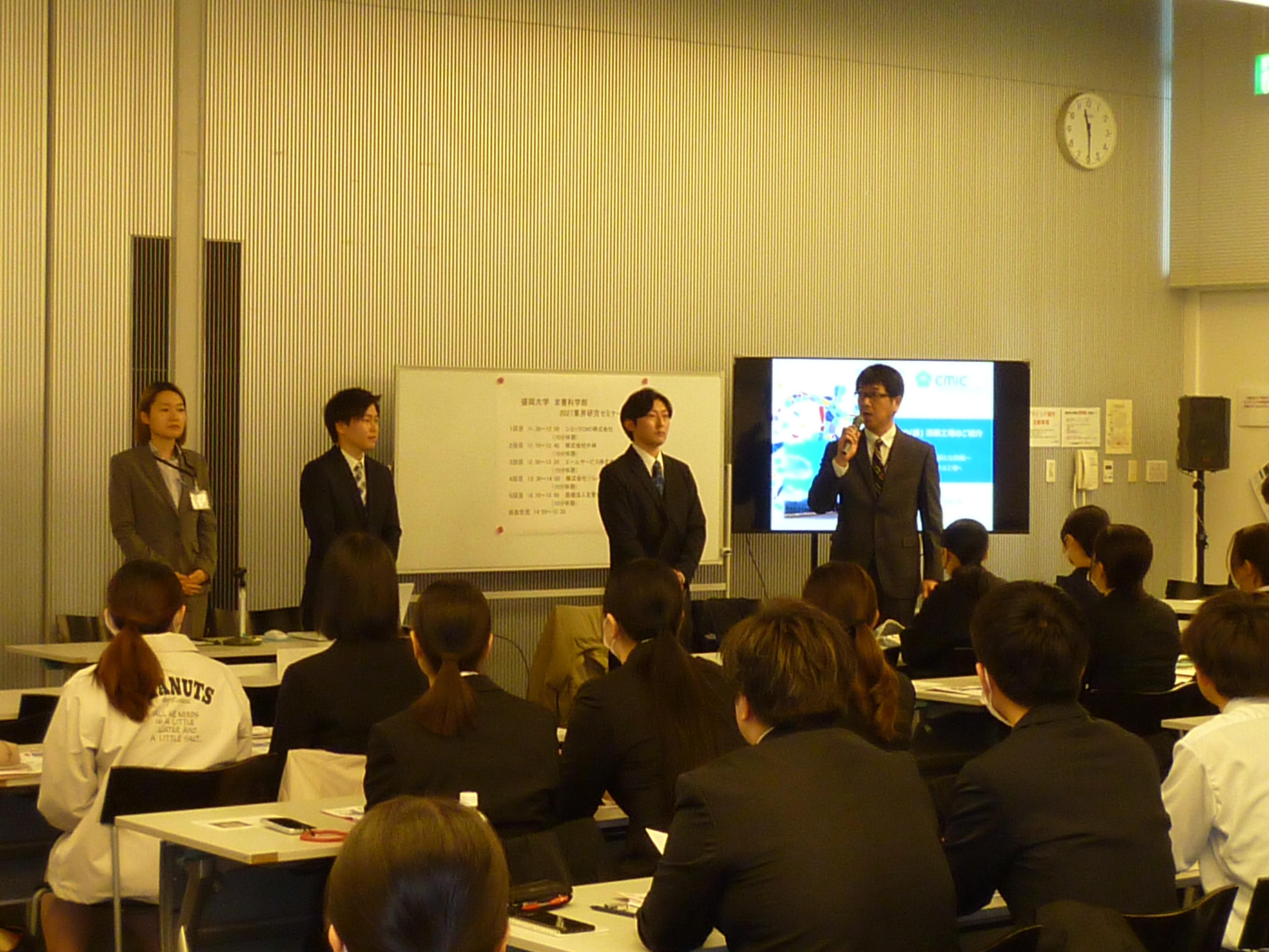 参加事業所は、主として栄養科学部の卒業生が勤務している事業所に対し就職センターがオファーを出し、5つの事業所が参加しました。各事業所の採用担当者が、学生の前で、自社の説明、勤務の様子、業界の特徴、採用活動のスケジュール等について30分間ずつ説明しました。参加した栄養科学部生65名の学生たちは、採用担当者の説明にメモを取りながら熱心に耳を傾けていました。