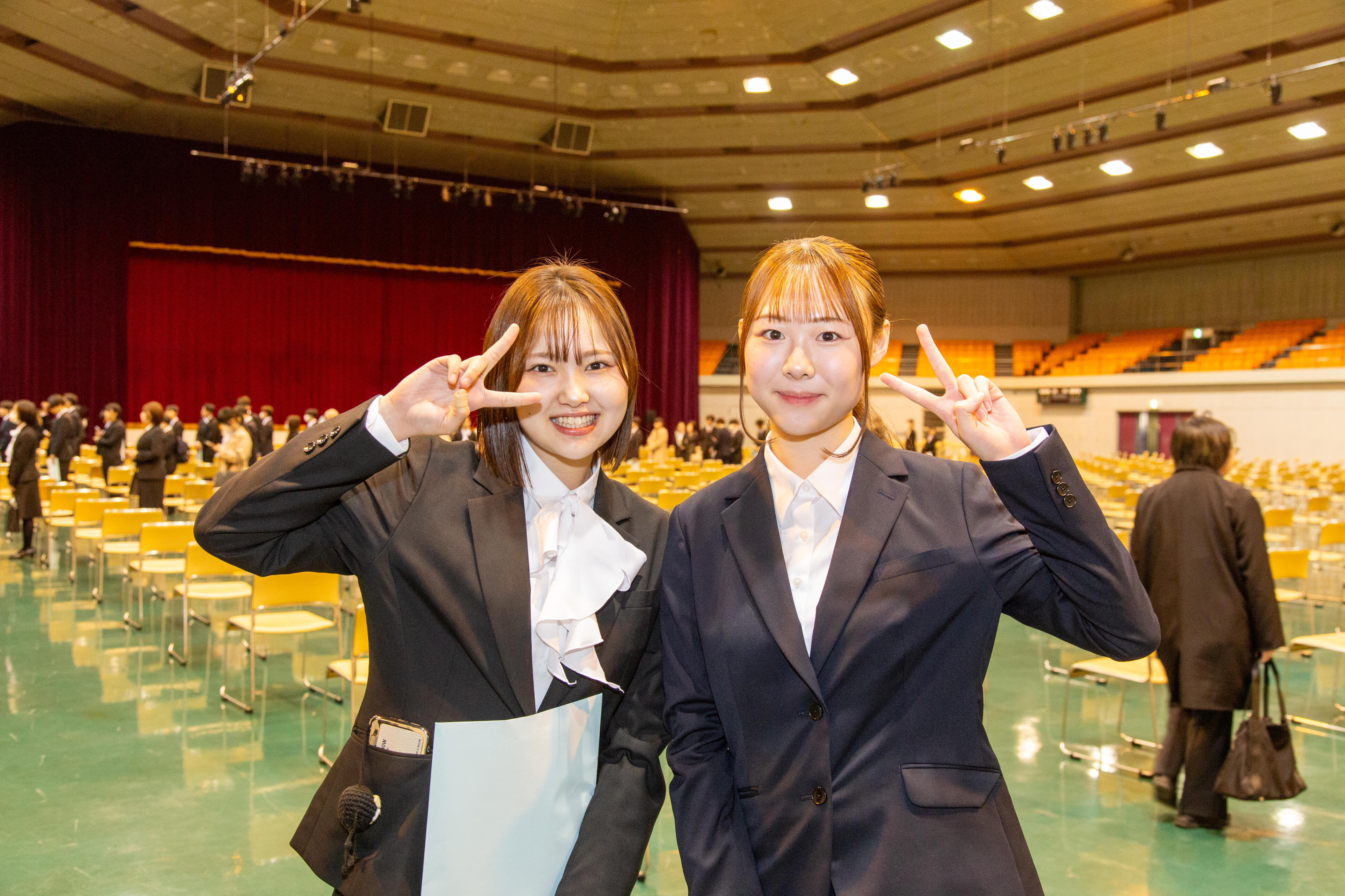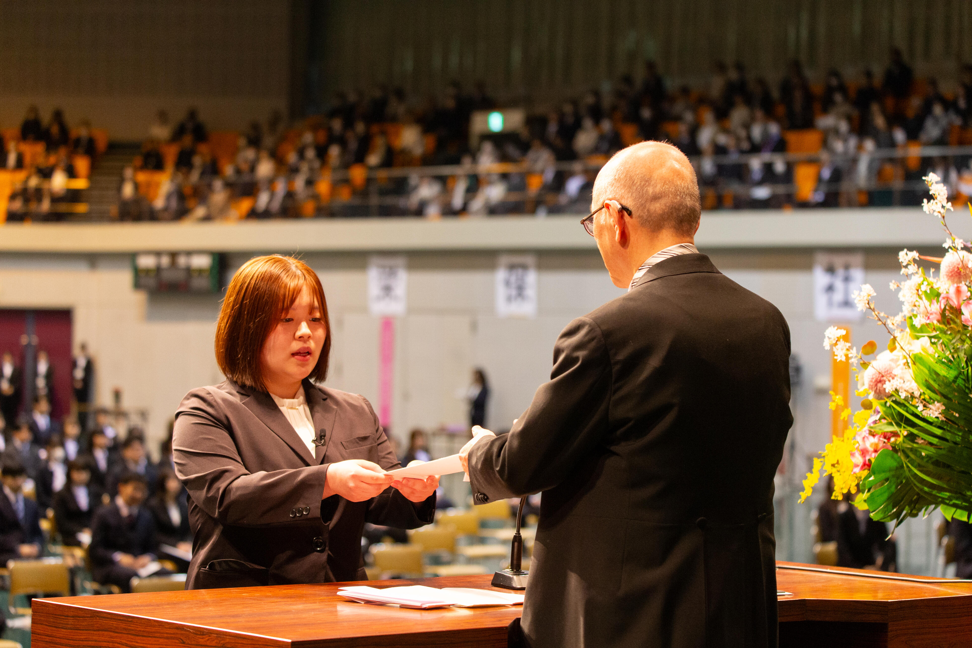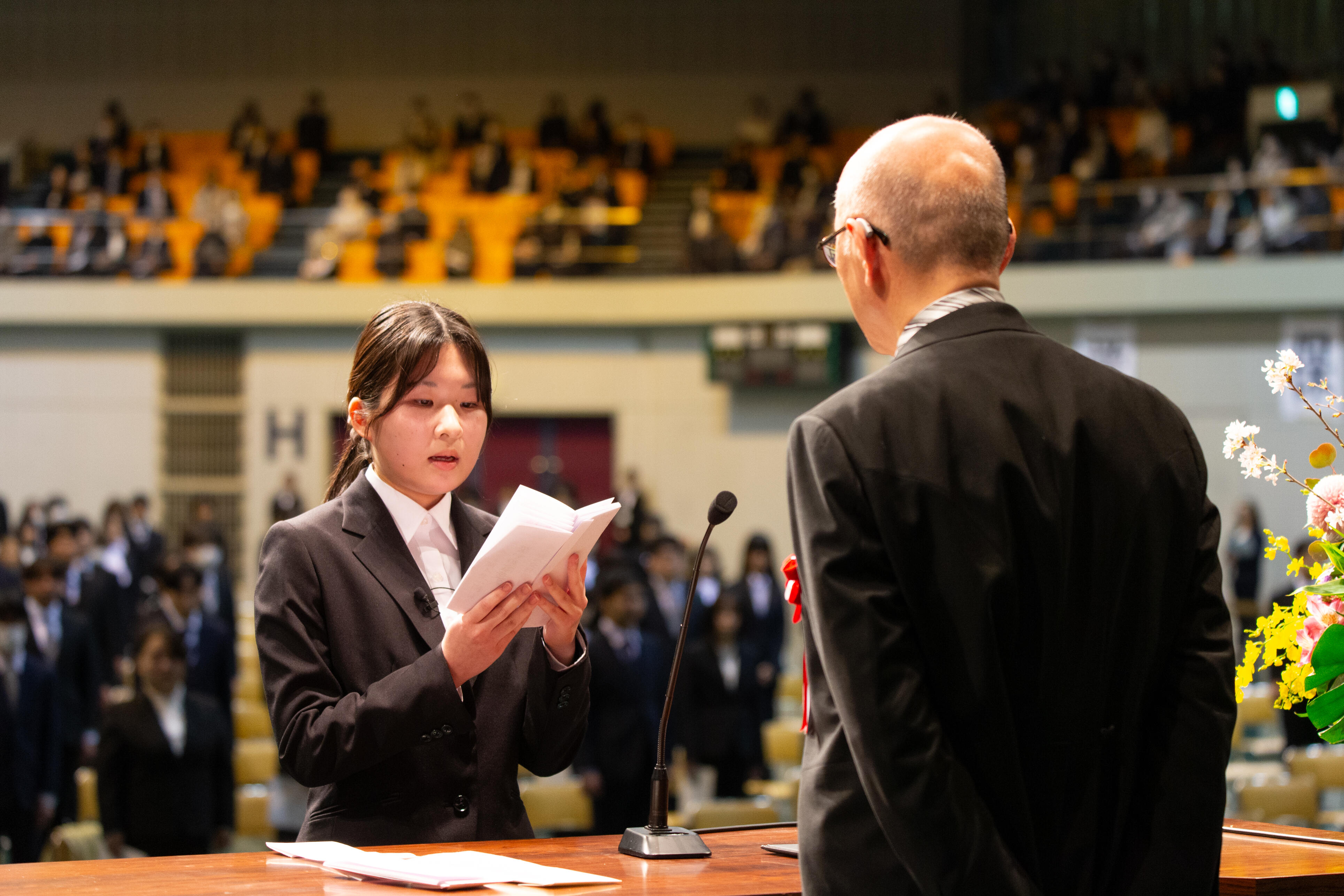 式典では、新入生代表として文学部児童教育学科の大内美優さん(南昌みらい高等学校出身)と、短期大学部幼児教育科の佐藤穂夏さん(盛岡市立高等学校出身)が誓いの言葉として、今後の目標や学生生活への決意を述べました。